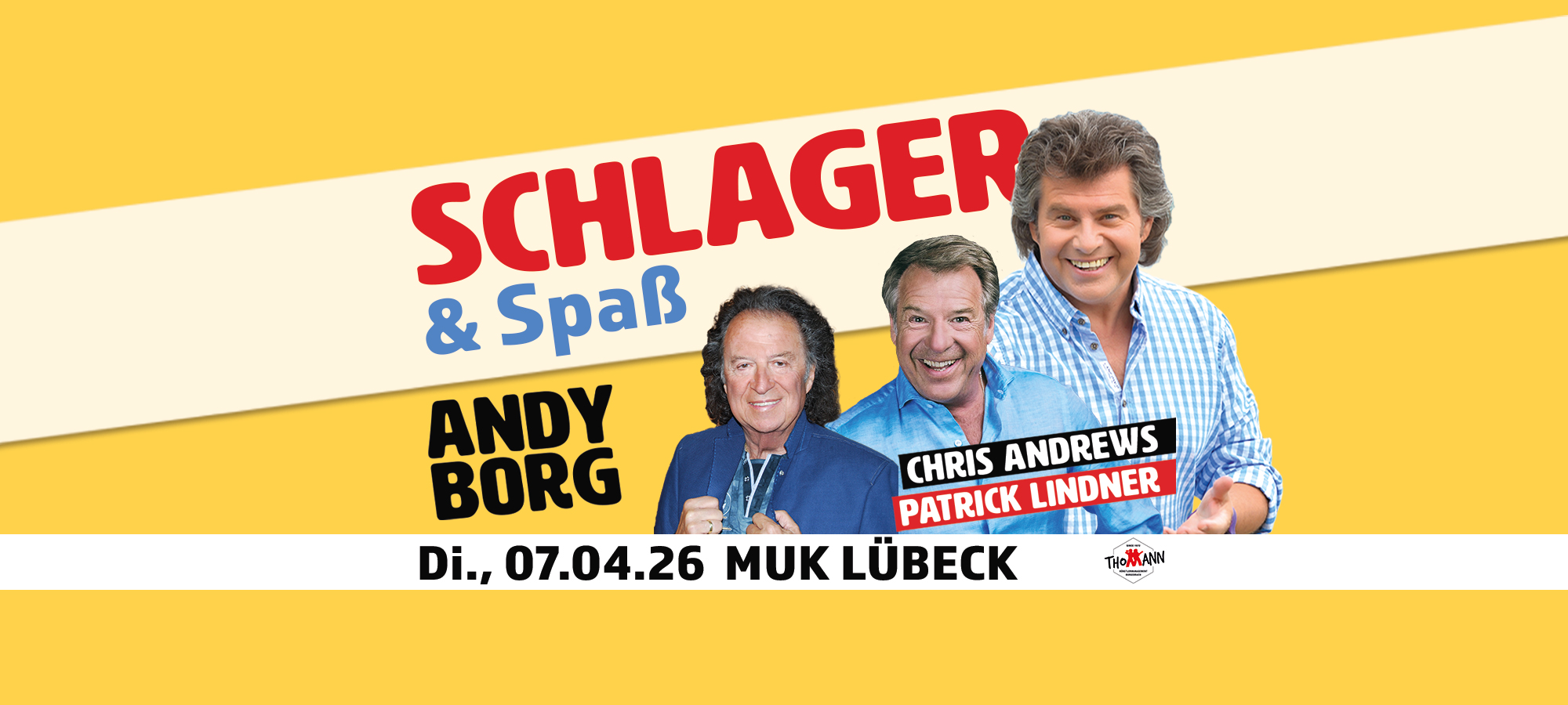 Schlager und Spaß! Wer könnte das besser verkörpern als die Schlagerikone mit garantiertem Spaßfaktor: Andy Borg! Zusammen mit seinen Gästen bringt er im Frühjahr 2026 den Spaß nach Lübeck und zelebriert Schlager von einem anderen Stern. An seiner Seite begrüßt Andy Borg unterschiedliche Stargäste von jung bis alt. In eurer Stadt begleiten ihn Chris Andrews und Patrick Lindner.